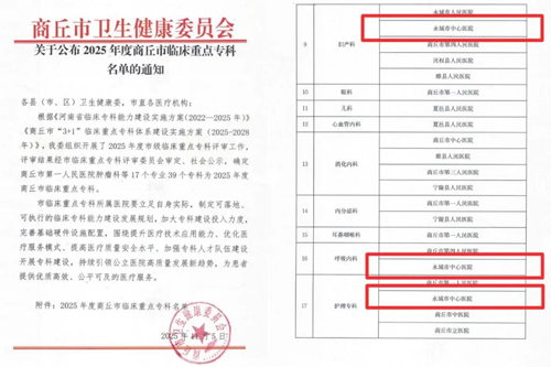 健康大河南讯:(责编:方帅 李万豪)为进一步加强永城市临床重点专科能力建设,推动医疗卫生健康事业高质量发展,根据《河南省临床专科能力建设实施方案(2022—2025年)》《商丘市“3+1”临床重点专科体系建设实施方案(2025-2028年)》,2025年度市级临床重点专科评审工作,根据专家评审结果,确定了2025年度市级临床重点专科名单。永城市中心医院护理专科、妇产科、呼吸内科、获批临床重点专科,标志着我院学科建设、团队水平取得新突破,综合服务能力和医疗技术水平迈上新台阶。