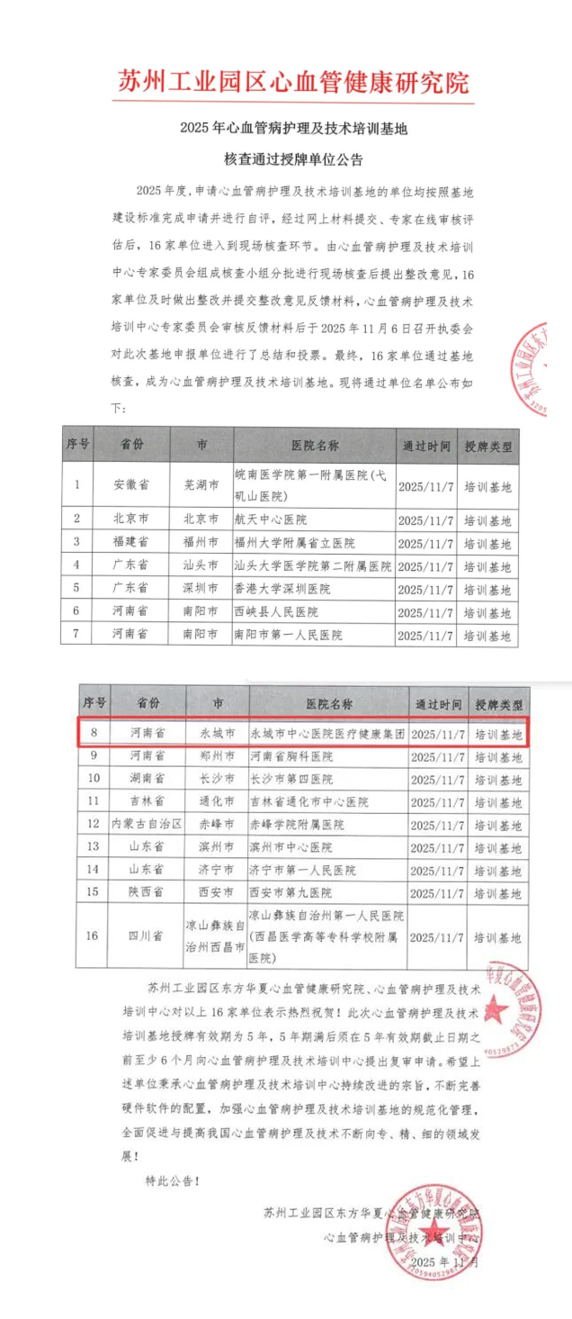 健康大河南讯:(责编:方帅 李万豪)11月6日,苏州工业园区东方华夏心血管健康研究院心血管病护理及技术培训中心发布了《2024年心血管病护理及技术培训基地核查通过授牌单位公告》,共有16家单位入选,永城市中心医院获批成为国家级心血管病护理及技术培训基地,标志着永城市中心医院心血管病护理领域及技术培训能力迈上了新台阶,为永城市人民群众的健康再添有力保障!