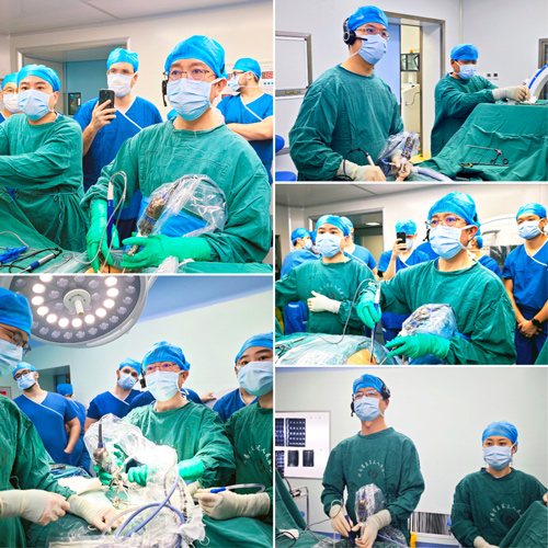 据了解,本次沙龙共设置5台机器人辅助下UBE手术直播,帮助大家学习掌握脊柱微创技术。5台手术演示分别是由杨贺军主刀的“UBE下颈椎前路(C5/6)MOEA-ACDF”;王宇鹏主刀的“UBE下腰椎(L4/5)椎管扩大减压术”;杨贺军主刀的“UBE下颈椎(C5/6)后路椎板开窗髓核摘除术”;唐骞主刀的“机器人辅助UBE下腰椎(L5/S1)椎间植骨融合经皮钉棒内固定术”;杨贺军主刀的“UBE下腰椎(L4/5)椎间植骨融合经皮钉棒内固定术”。手术直播过程中,由刘少军教授、高二龙教授、唐桦教授、李全教授解说手术操作要点,并与现场多位专家,共同讨论解答脊柱疑难病例。