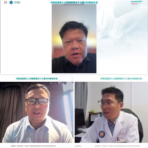会议以线上直播+现场会议的形式召开,本次会议,河南省直三院脊柱微创外科一病区主任、UBE(单侧双通道脊柱内镜)首席专家杨贺军为大会主席,特邀新加坡伊拉莎白医院医疗中心Dr.Pang Hung Wu教授、四川省遂宁市中心医院李广州教授、空军军医大学唐都医院李晓祥教授线上参加会议。河南省直三院副院长袁启东,院长助理、脊柱微创外科首席专家周红刚,河南省慈善联合总会·道健基金干事李娜,以及来自巴西的国际脊柱微创外科医生参加开幕式。开幕式由河南省直三院脊柱微创外科腰椎管狭窄微创学组组长唐骞主持。