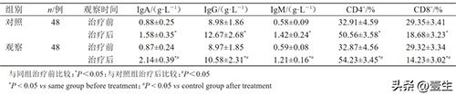 研究发现,在临床疗效方面,治疗后,对照组和观察组的总有效率分别为83.33%、95.83%,两组总有效率比较差异具有统计学意义(P<0.05);观察组肺功能指标FEV1和FVC水平均显著高于对照组(P<0.05),表明连花清瘟联合阿奇霉素能在短时间内改善患者肺功能,且具有较好的临床疗效。观察组患者IgG、IgM和CD8+水平显著低于对照组,差异具有统计学意义(P<0.05)。