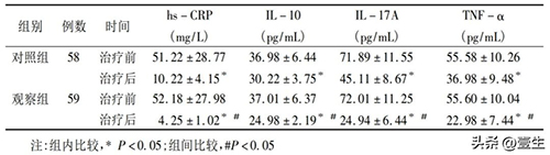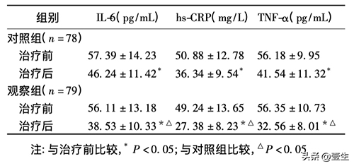 连花清瘟具有中医药多靶点、多途径、多环节以及整体治疗的优势,对炎性损伤具有一定的拮抗作用,本研究显示血清白细胞介素-6(IL-6)、超敏C反应蛋白(hs-CRP)、肿瘤坏死因子-α(TNF-α)水平均降低,观察组低于对照组(P<0.05)。
