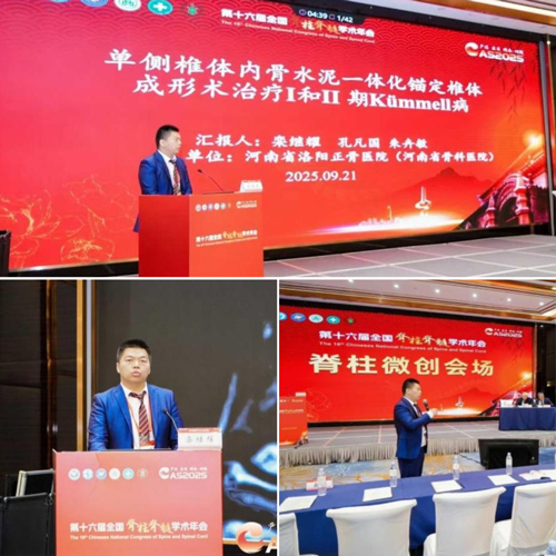 河南省洛阳正骨医院(河南省骨科医院)脊柱微创外二科栾继耀博士则围绕Kümmell病的微创治疗,报告了《单侧椎体内骨水泥一体化锚定椎体成形术治疗I和II期Kümmell病》,体现出医院在脊柱微创基础与临床研究方面的前沿探索。